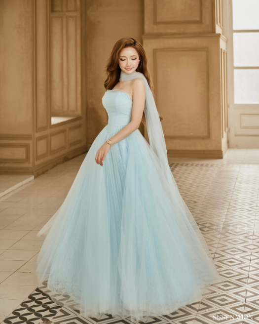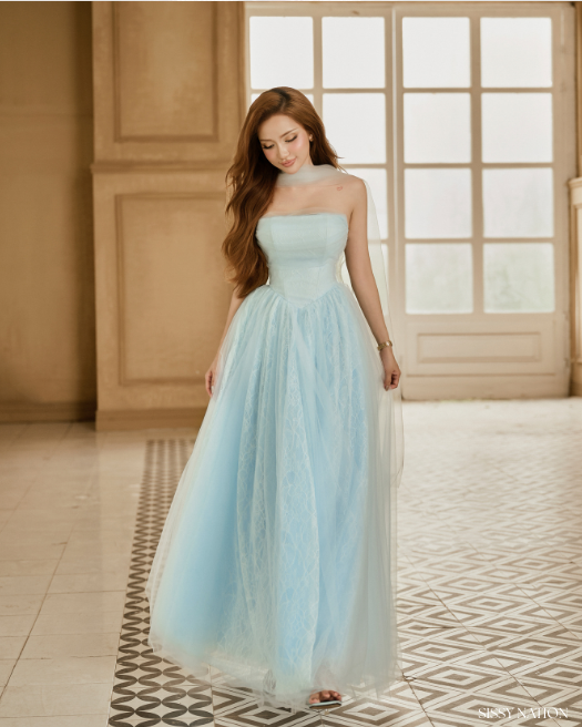 Like a whisper of the sky at dawn, this pastel blue gown radiates serenity and grace. The corset bodice sculpts the waist beautifully, while the airy layers of mesh create a dreamlike flow. Each movement feels weightless, soft, and enchanting - perfect for fairytale moments.
