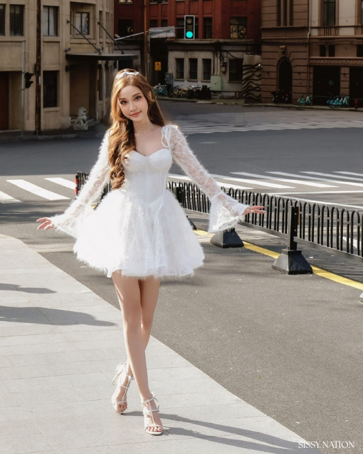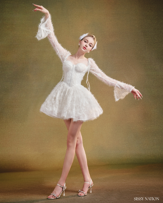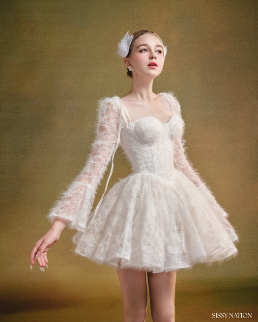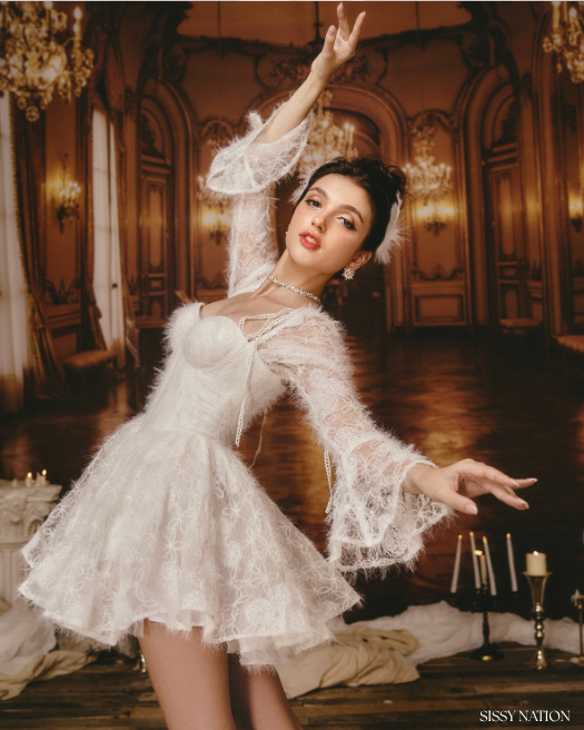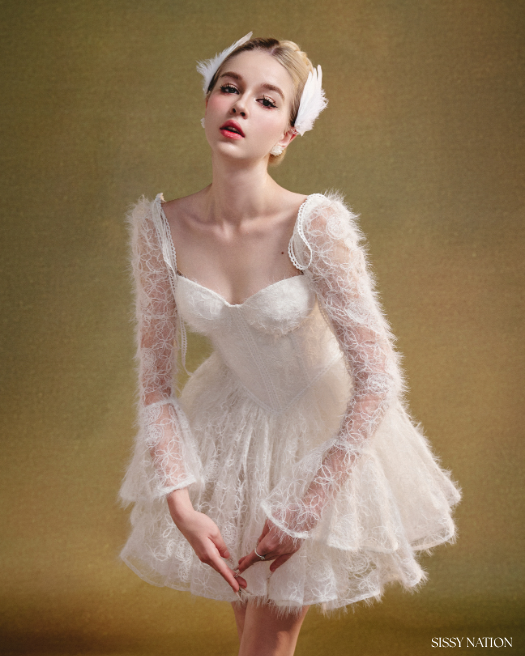 Made from plush faux fur fabric, this dress wraps you in luxurious softness, while the delicate white lace overlay evokes the elegance of a swan’s wings. The corset-style bodice offers a perfect fit. Sparkling sequins add a subtle, enchanting shimmer, catching the light with every movement.