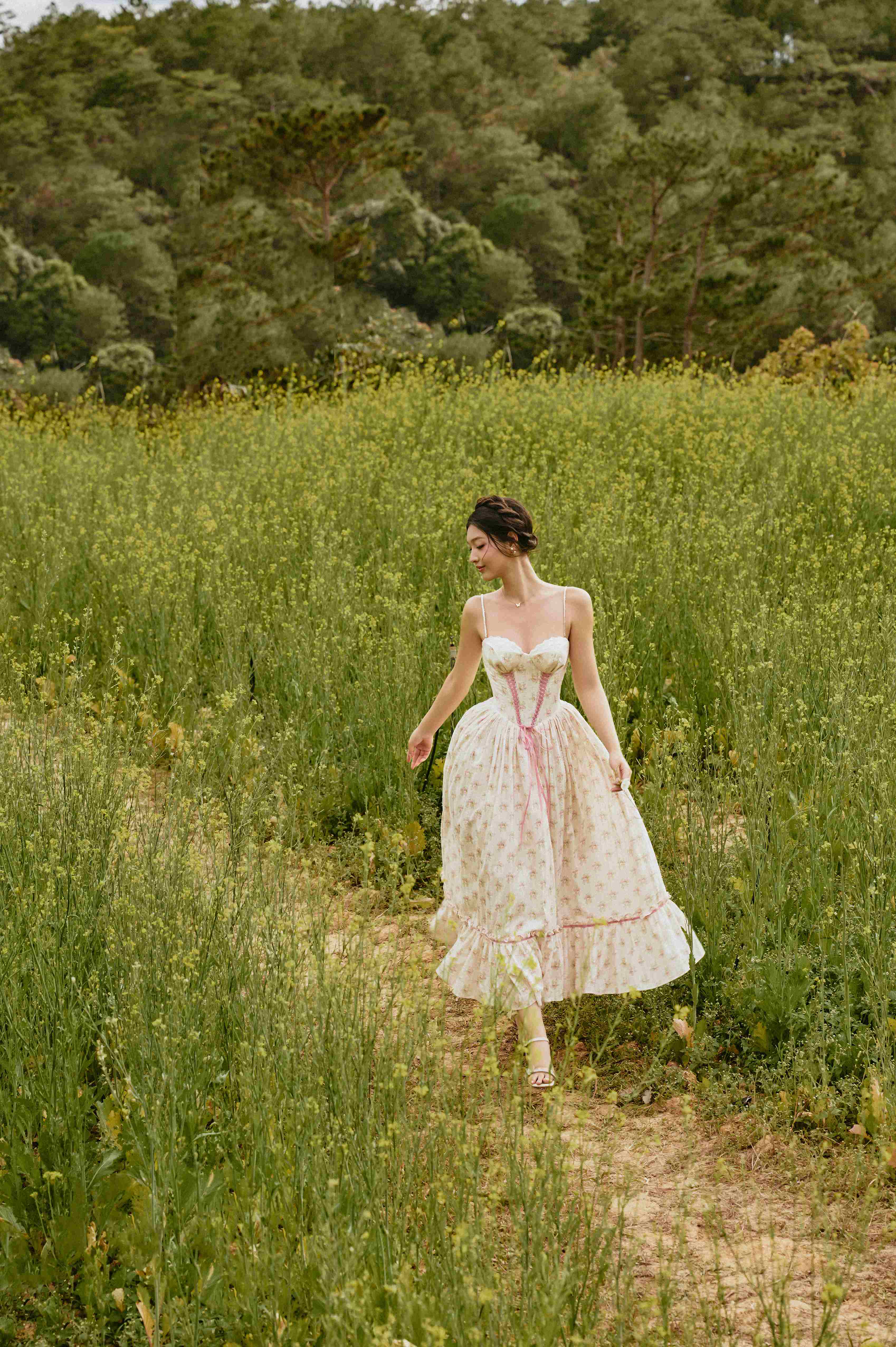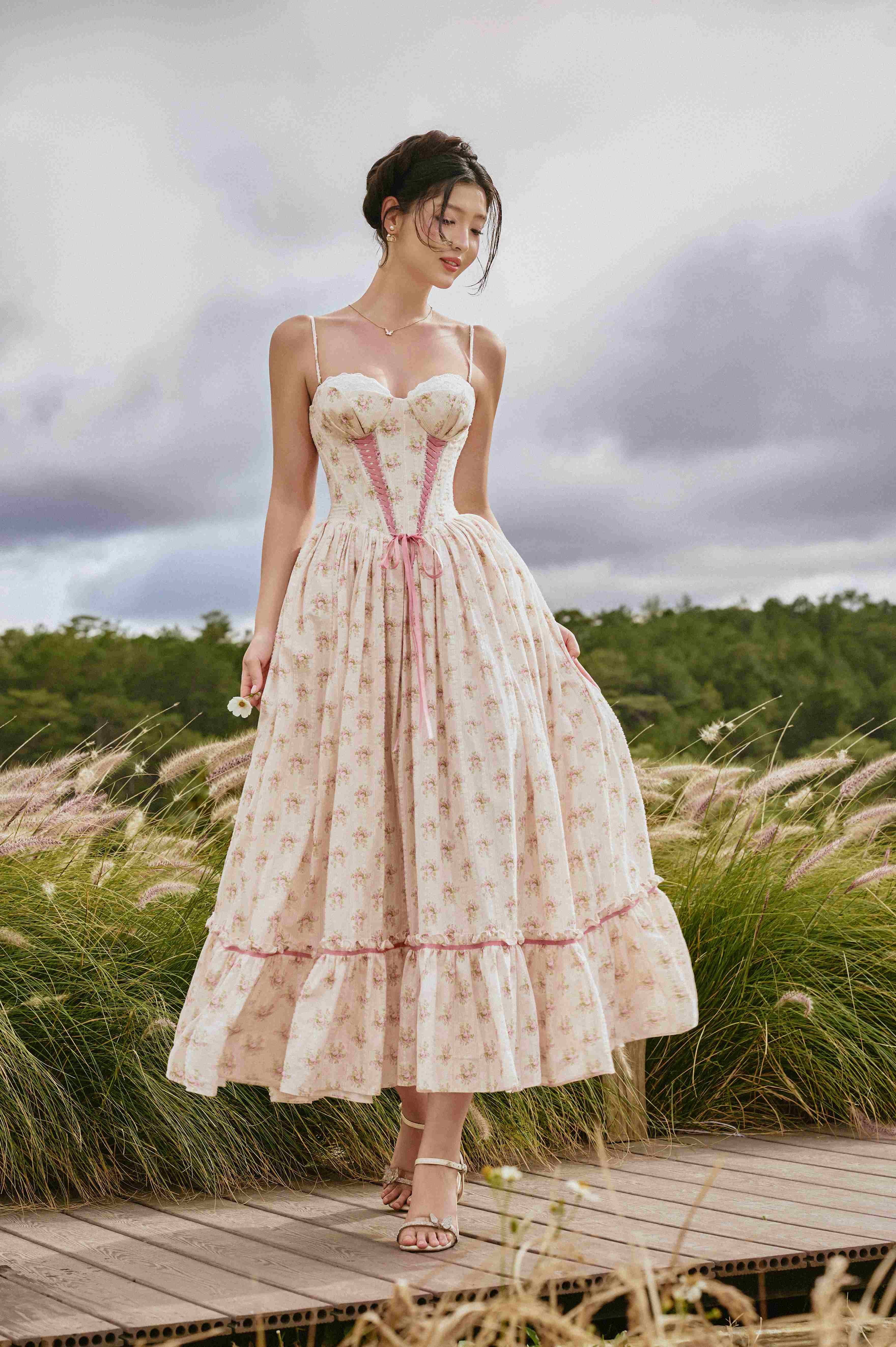 Francesca Corset Dress made for the romantic countryside muse. Sweetheart neckline corset, pastel pink ribbon and a dainty bow bring timeless vintage charm. Full multi-tiered skirt with soft ditsy florals on cream effortlessly feminine, never out of style. Perfect for picnics, golden hour shoots & garden parties.