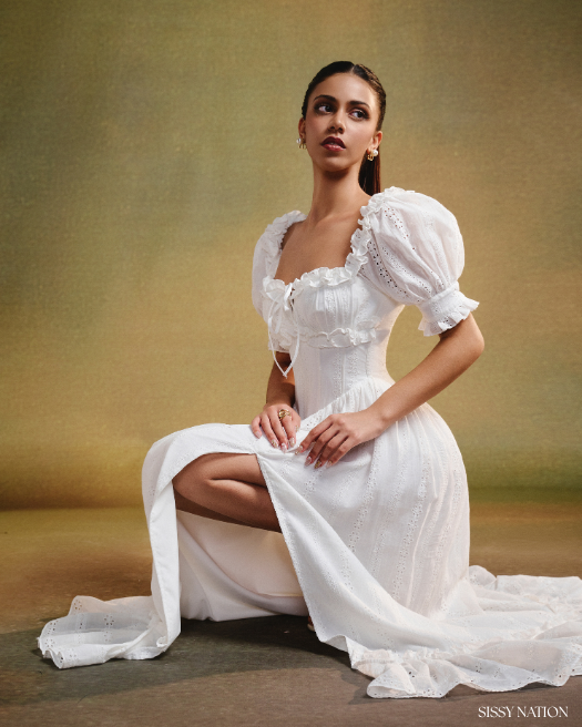 A vision of innocence and allure, the Miranda Corset Dress in white reimagines countryside romance through the lens of modern femininity.