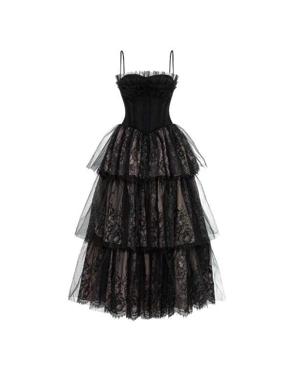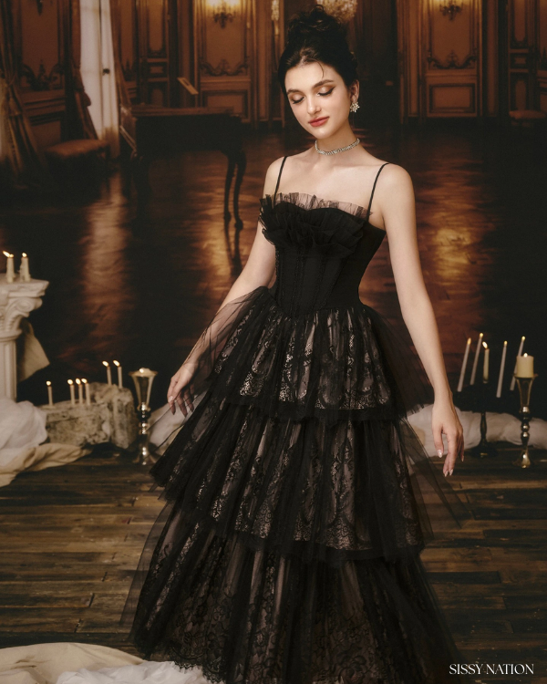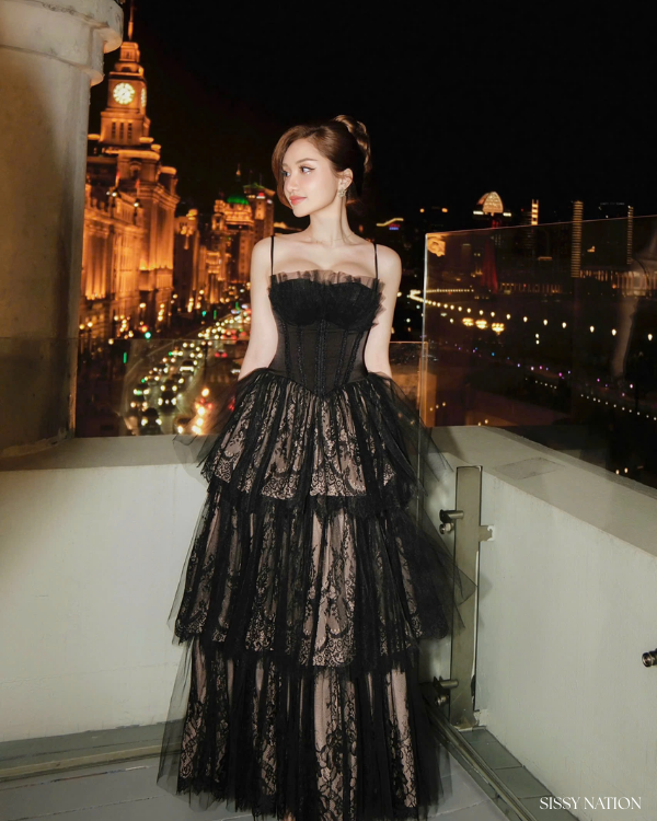 Meet the queen of the night, this new black layers corset dress exudes timeless beauty with a modern twist. Made from delicate black lace layered in alluring patterns, this dress is sure to capture every eye. The corset-style bodice provides a perfect fit, while the delicate mesh fabric along the bust is gathered into soft ruffles, adding a romantic, ethereal touch.