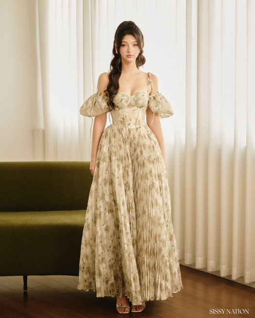 Bathed in soft sunshine and adorned with delicate floral prints, the Tiana Corset Pleated dress in green brings to life the quiet elegance of a garden romance. Its structured corset bodice cinches gracefully, while the pleated skirt flows with every step like poetry in motion.