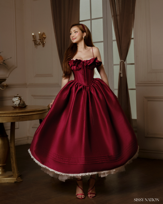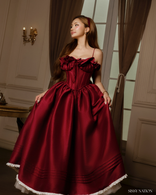 Radiating the brilliance of a ruby gem, the Tulip Corset Dress embodies timeless glamour and feminine allure. Designed in a lustrous ruby tafta, the piece features a structured corset bodice that sculpts the waist and accentuates every graceful curve. The voluminous skirt blooms like a tulip in full flourish, while delicate ruffles along the neckline add a romantic, vintage charm.